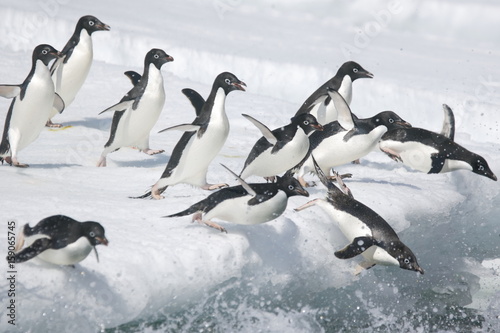 Naklejka premium Pingwiny Adeli skaczą do oceanu z góry lodowej