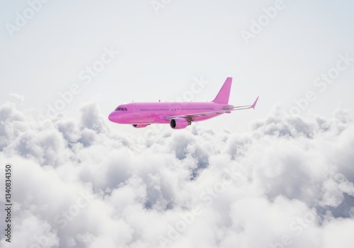 © moo, Fototapeta premium Pink Airplane Flying Among the Clouds. Dreamy Concept, Travel Adventure. Commercial Aviation for Business, Promotional Web Banner, Creative Print Ad, or Greeting Card