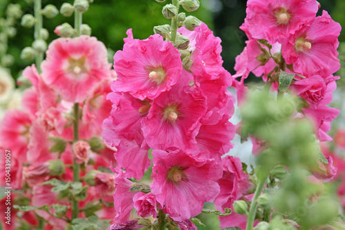 Obraz premium Pink Alcea rosea, or hollyhock, in flower.