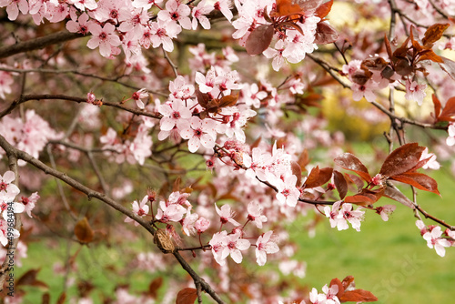Fototapeta premium Pink almond tree branches in bloom. Wallpaper texture.