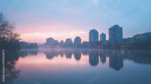 Obraz premium Pink and blue cityscape at sunrise reflected over calm water