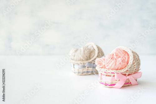 Obraz premium Pink and blue decorative straw cradles with thread hearts. Baby shower ideas,...