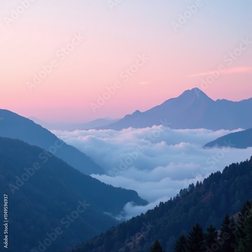 Fototapeta premium Pink and blue misty fog rolling over a mountain landscape, gradient, abstract...
