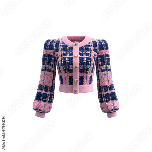 © PixelGen, Obraz premium Pink and Blue Plaid Cropped Cardigan Sweater