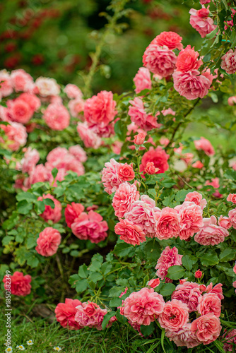 Fototapeta premium Pink and coral roses fill a lush garden, their petals soft and inviting under the sun