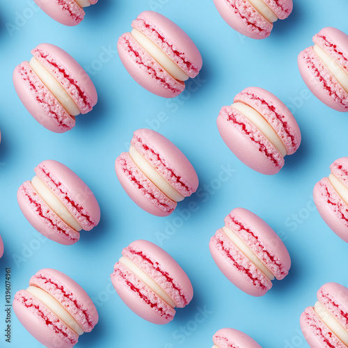© CleanPhotos, Obraz premium Pink and Cream Macarons Pattern on Blue Background