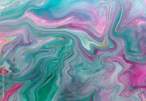 © Anna Babii, Obraz premium Pink and green mixed inks spilled on white paper background. Golden glitter texture.