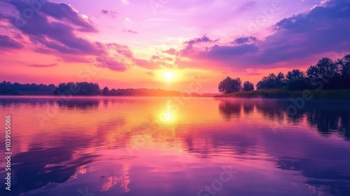Fototapeta premium Pink and orange sunset reflecting on a serene lake, with purple skies and a...