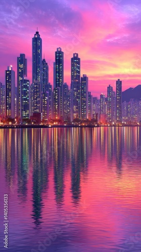 © CHAOSUA, Fototapeta premium Pink and Purple City Skyline Sunset Reflection