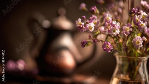 © Anastasiia, Fototapeta premium Pink and purple small flowers in a glass vase on a wooden table, with a soft, blurred background. Concept Soft focus background, Pink and purple flowers, Glass vase details, Wooden table texture