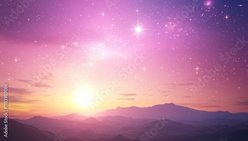 © adinuranjaya, Fototapeta premium Pink and Purple Sunset Illuminates Majestic Mountain Peaks Under a Starry Sky
