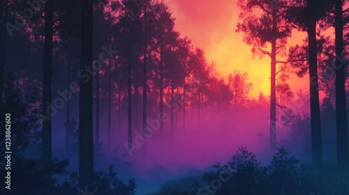 © Sleeping Carbuncle, Fototapeta premium Pink And Purple Sunset In A Foggy Forest