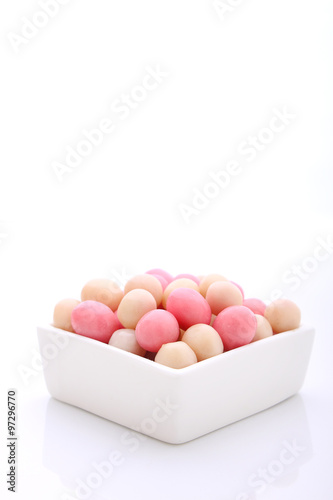 Fototapeta premium pink and white candy in a round white plate on a white background