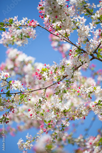 © HunYoung, Fototapeta premium Pink and white cherry tree blossom with sky blue background