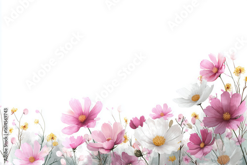 Fototapeta premium Pink and White Cosmos Flowers Border on White Background