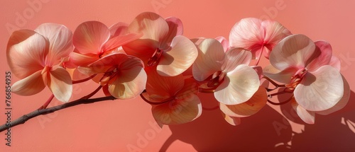 © Albert, Fototapeta premium Pink and white flower arrangement on a pink background with a shadowed pink branch