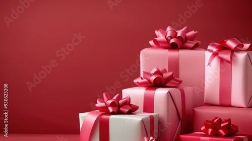 Fototapeta premium Pink and white gift boxes with matching pink ribbons and bows, stacked and arranged on a red background.