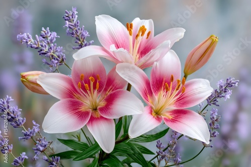 Fototapeta premium Pink and white lilies and lavender flowers creating a beautiful bouquet