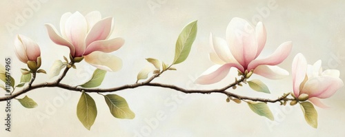 © Viacheslav, Fototapeta premium Pink and white magnolia flowers on a delicate branch with green leaves against a soft, neutral background, showcasing their natural beauty and elegance in floral