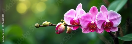 © LomaPari2021, Fototapeta premium Pink and white orchid flowers on a branch with leaves and stems, plants, branches