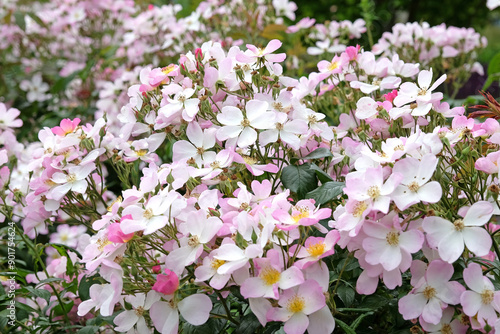Naklejka premium Pink and white shrub rose, rosa ‘Lyda Rose’ in flower.