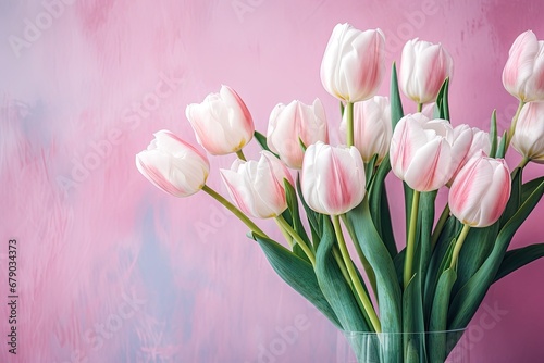 Fototapeta premium pink and white tulips of the on the pink background