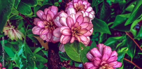 © Mohit, Obraz premium pink and yellow flowers dahlia in rain