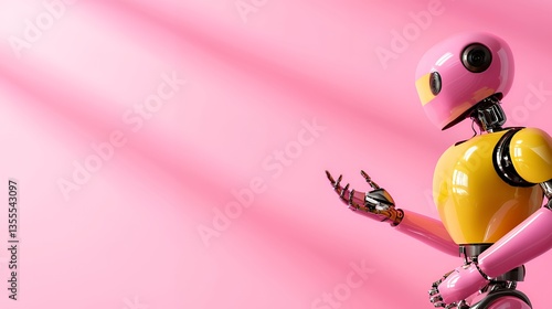 © Arfin, Obraz premium Pink and Yellow Robot Figure Against Soft Pink Background Reaching Out
