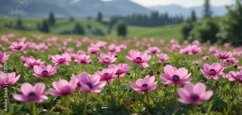 Naklejka premium Pink anemone flowers in a field with blurred effect , pink anemone, ranunculaceae, flowers