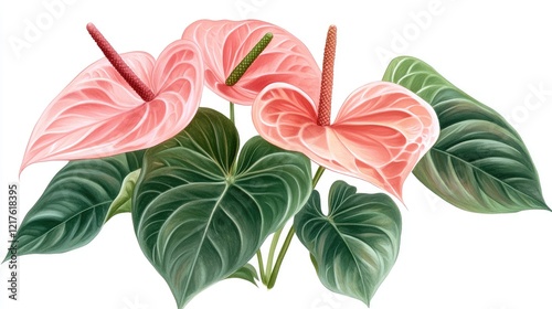 © DigitalDruid, Obraz premium Pink Anthurium Flowers with Green Leaves Isolated on White Background Copy Space
