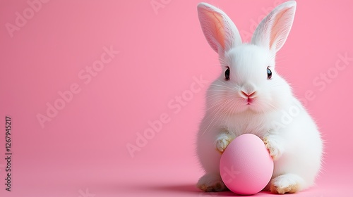 © budiyono, Obraz premium Pink backdrop Easter bunny holding egg