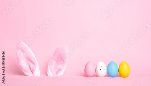 Fototapeta premium Pink background with bunny ears and colorful Easter eggs