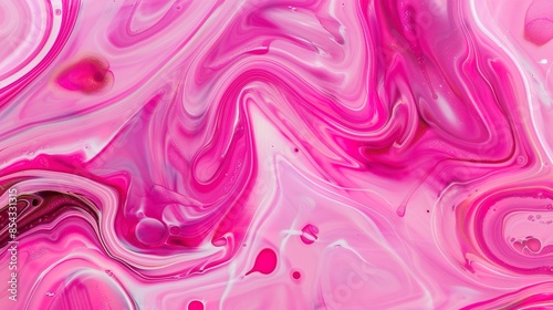 © Thanthara, Obraz premium Pink background with fluid acrylic pour patterns, close-up view, swirling colors, dynamic and artistic