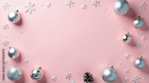 Fototapeta premium Pink Background with Silver and Gold Ornaments and Snowflakes for Festive Season