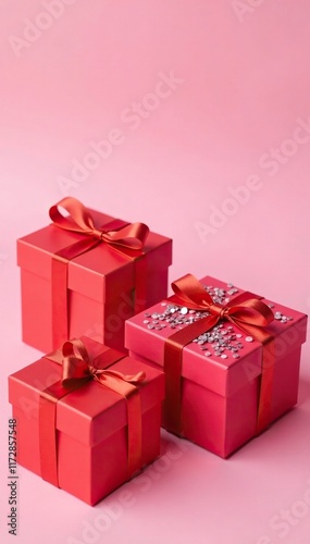 © Wachiraporn, Fototapeta premium Pink background with three red gift boxes containing sequins, decoration, decorative items, gift boxes