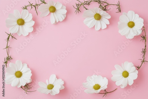 Fototapeta premium Pink background with white cosmos flowers in corners, wedding card decoration...