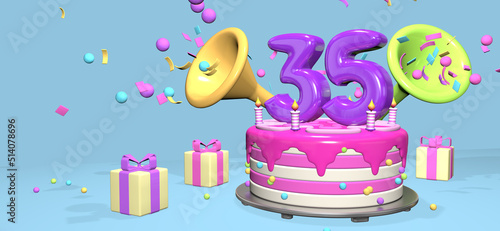 © alejomiranda, Fototapeta premium Pink birthday cake with thick purple number 35 surrounded by gift boxes with horns ejecting confetti on pastel blue background. 3D Illustration