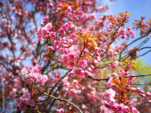 Obraz premium Pink blossom on the branches of a cherry tree in spring with a blue sky...