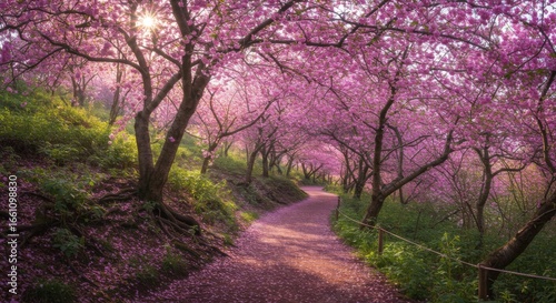 © AoiHikari, Obraz premium Pink Blossom Pathway: Sunlit Path Through a Floral Garden
