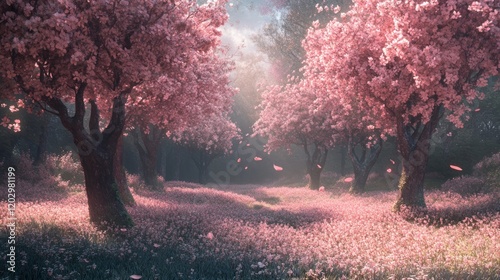 Naklejka premium Pink Blossom Trees In A Magical Forest