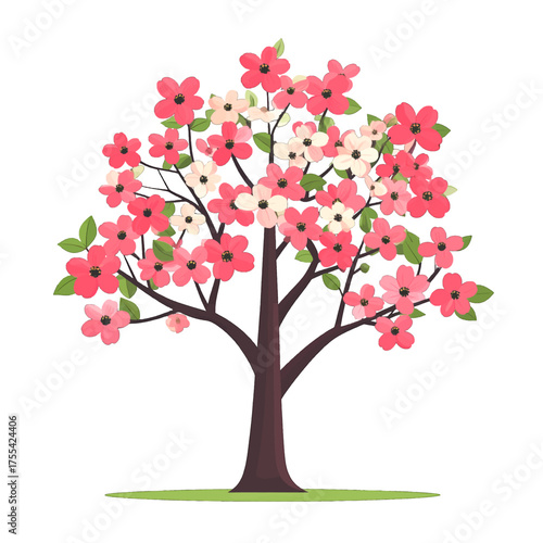 © Muhyidin, Fototapeta premium Pink Blossoming Tree Illustration with White Background and Spring Theme Botanical Illustration with Delicate Petals and Fresh Green Leaves Optimized for Stock