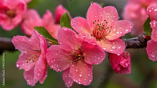 Fototapeta premium Pink blossoms covered in dew glisten under soft morning light in a tranquil...