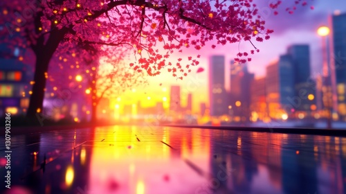 Fototapeta premium Pink blossoms fall on a city street at sunset, creating a magical, dreamy...