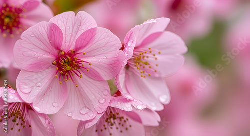 © Sajida, Obraz premium Pink blossoms with water droplets – close-up floral macro