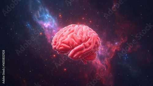 Fototapeta premium Pink brain floats in a vibrant cosmic nebula.