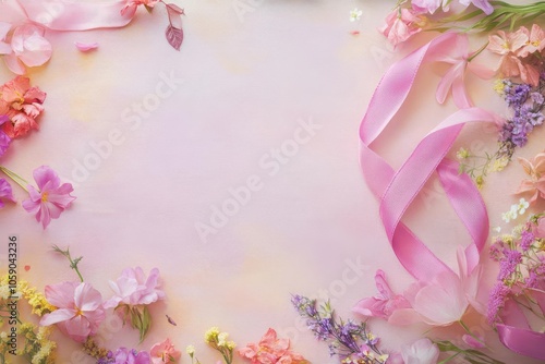 Fototapeta premium Pink breast cancer ribbon with soft floral border, uplifting and compassionate design