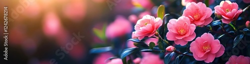 © BerkahStock, Fototapeta premium Pink camellia blossoms in sunlight.