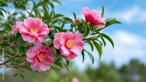 © kardaska, Fototapeta premium Pink Camellia flowers blooming on a tree branch against blue sky