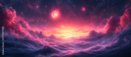 © Mega, Fototapeta premium Pink celestial cloudscape with double sunset