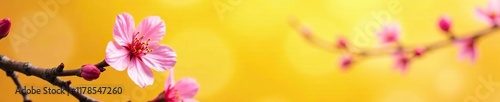 © Withun, Fototapeta premium Pink cherry blossom against a warm yellow background, yellow, blooming, branches